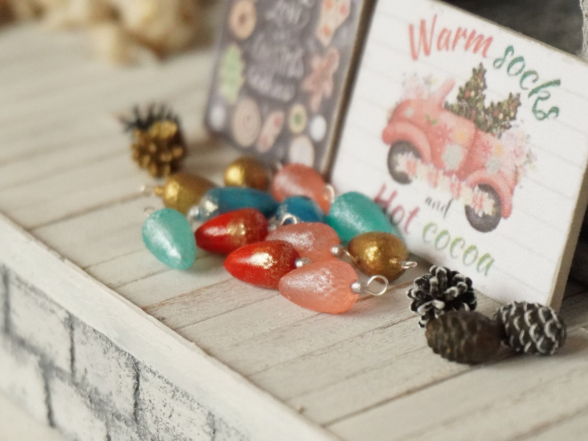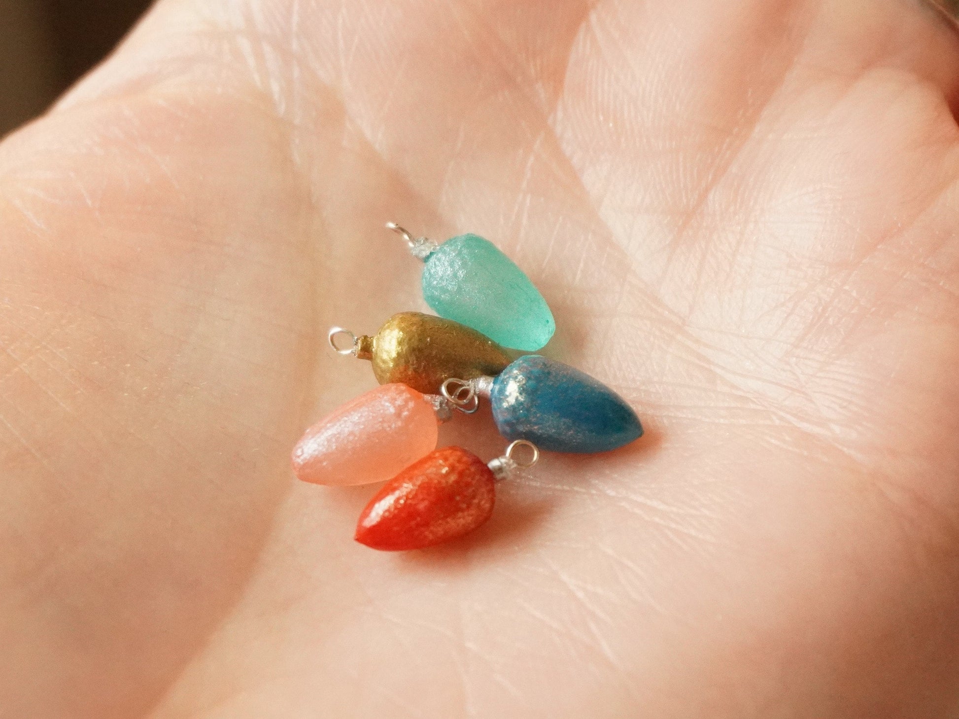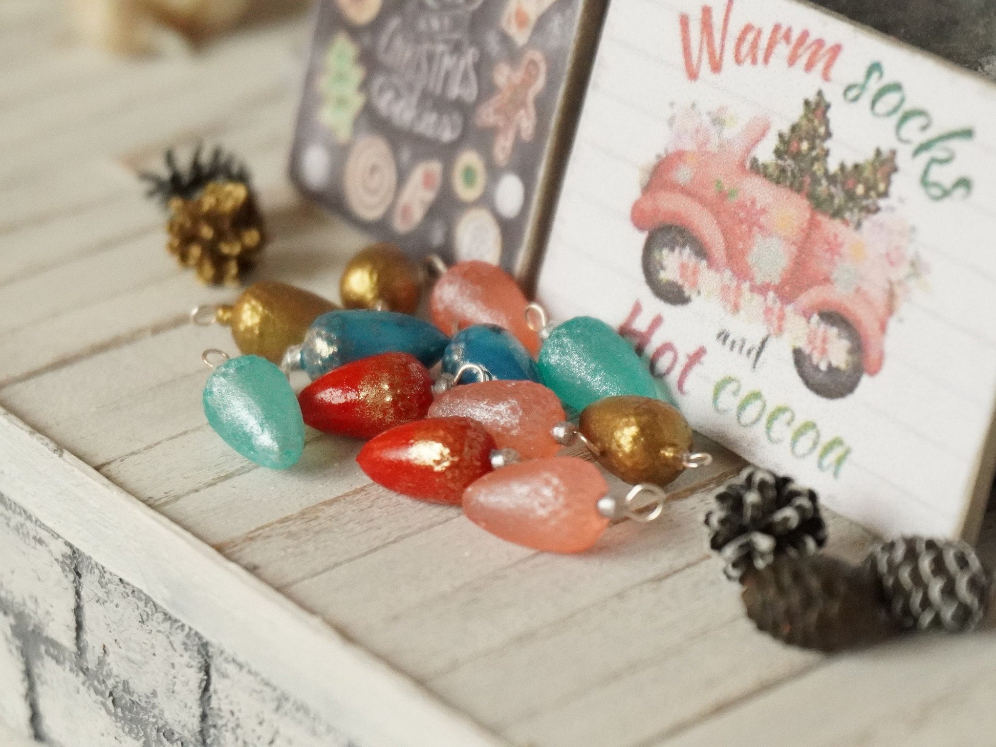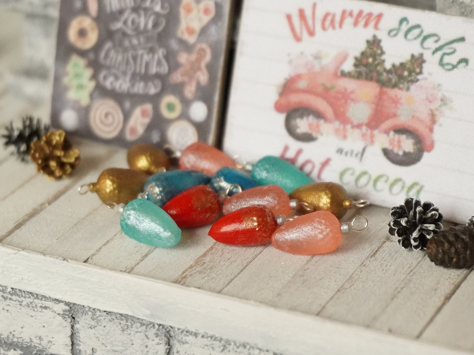 Dollhouse miniature Christmas acorn shaped ornaments, made in 1:12 scale.
