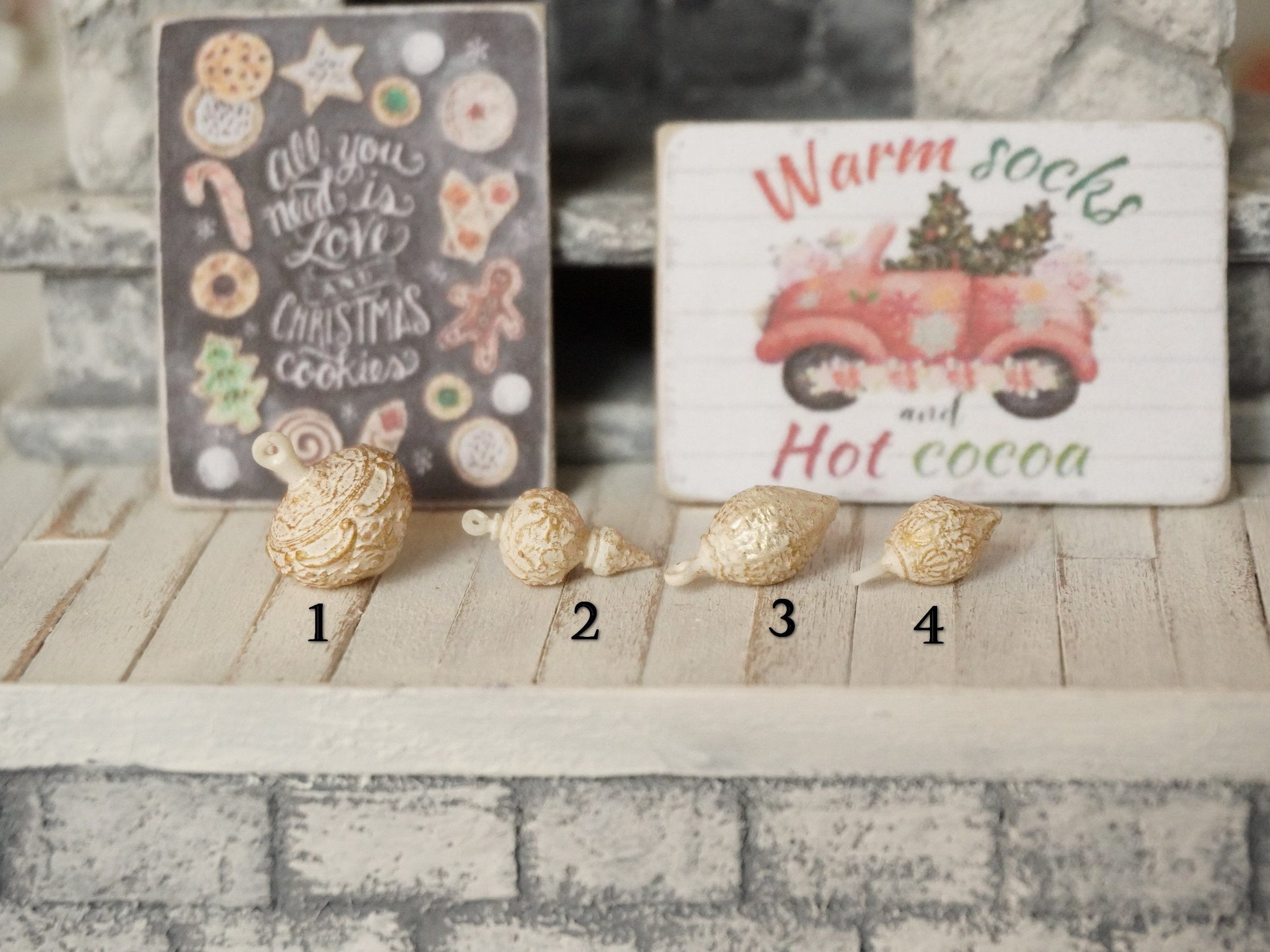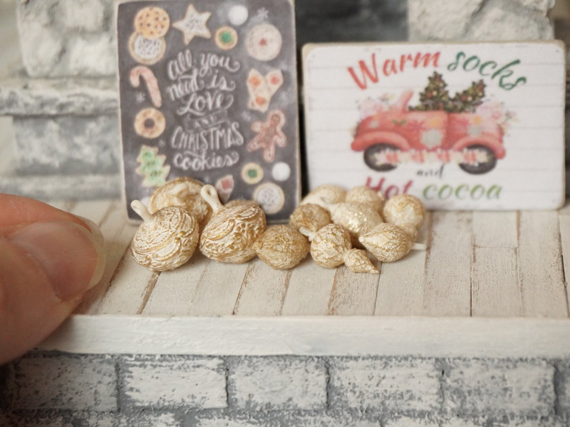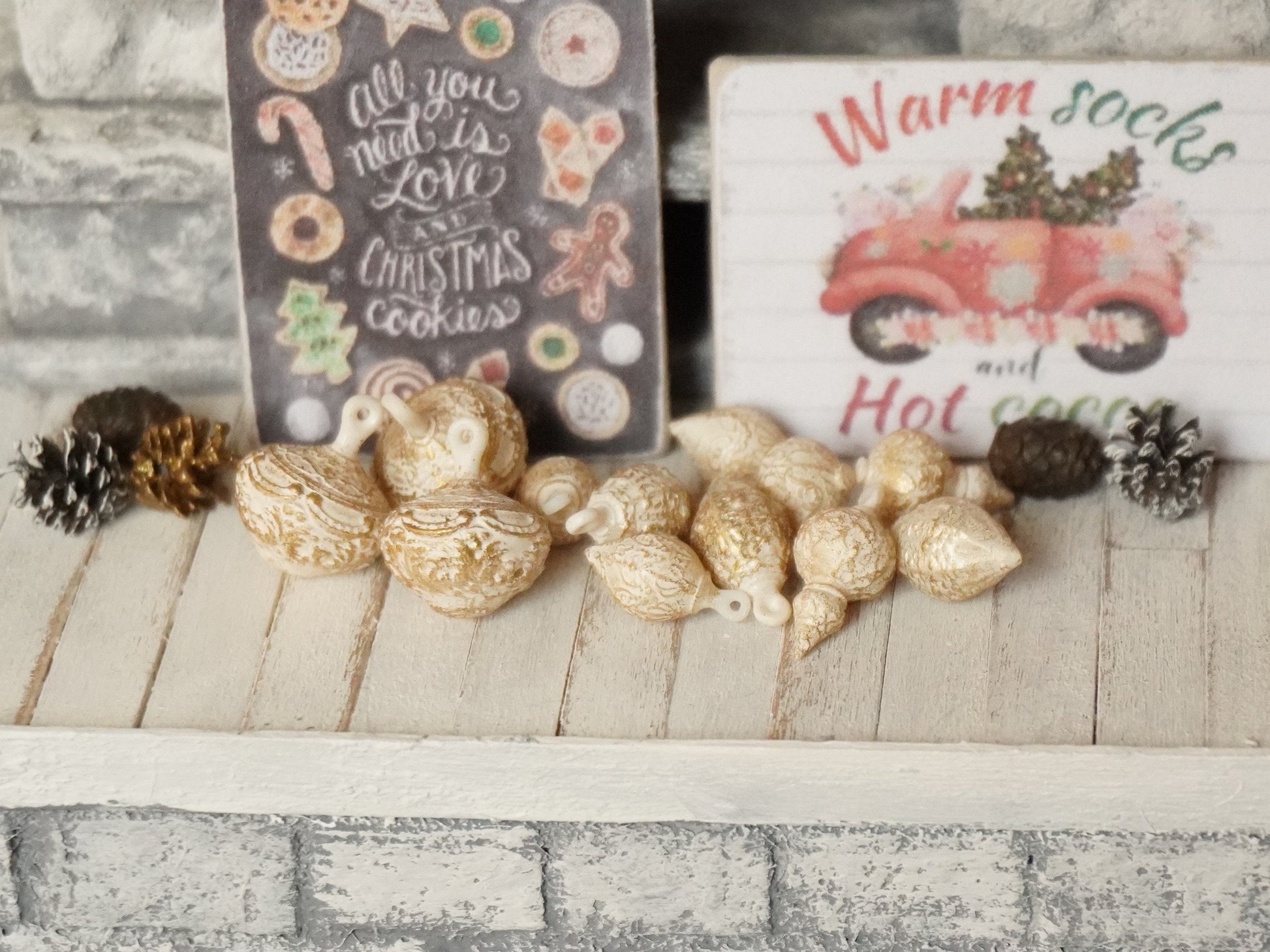 Dollhouse miniature Christmas ornaments in ornate style, made in 1:12 scale.