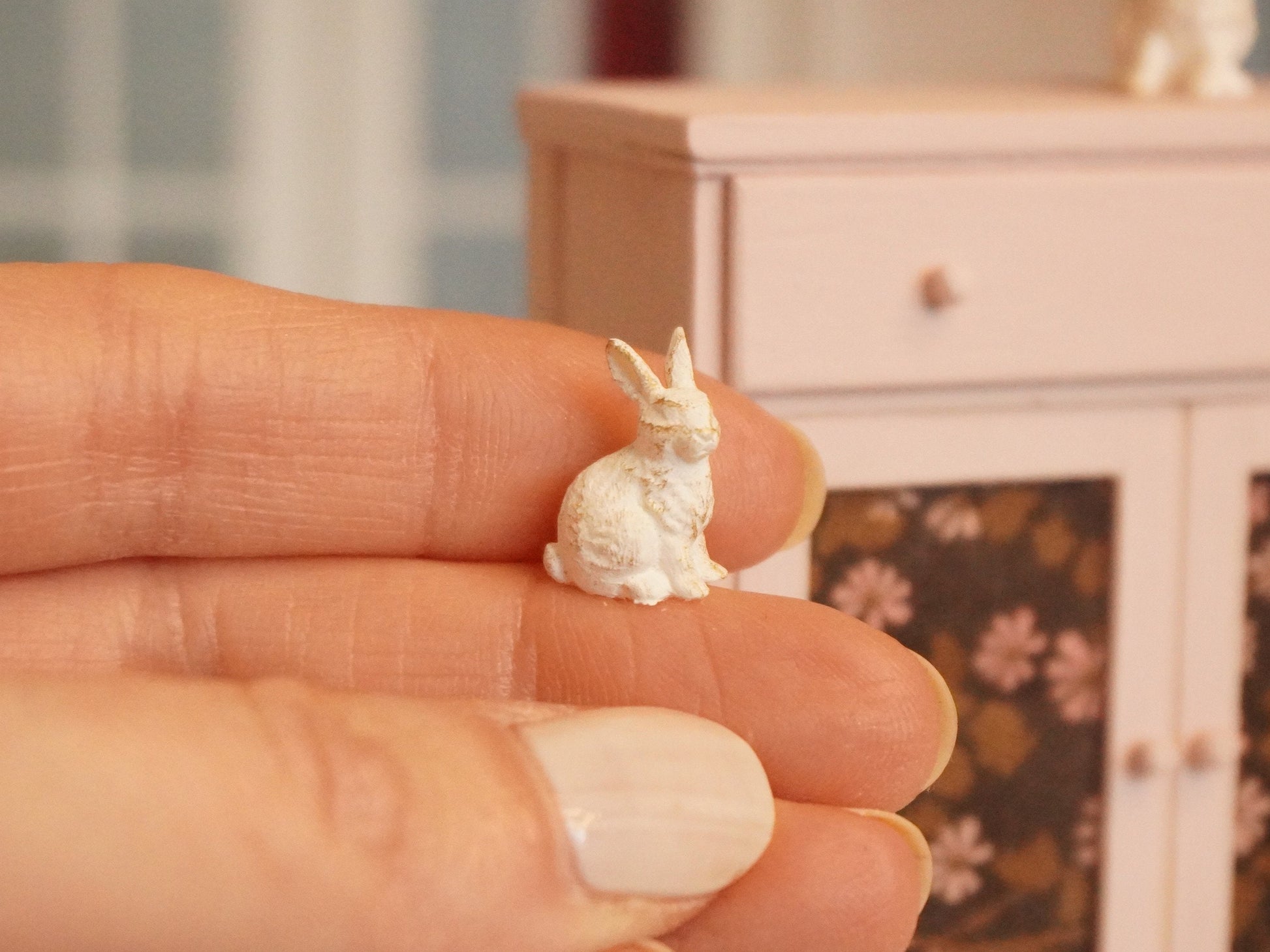 Miniature 1:12 scale decor bunny, 3d printed in resin and handpainted in white color with touch of gold wax paint.