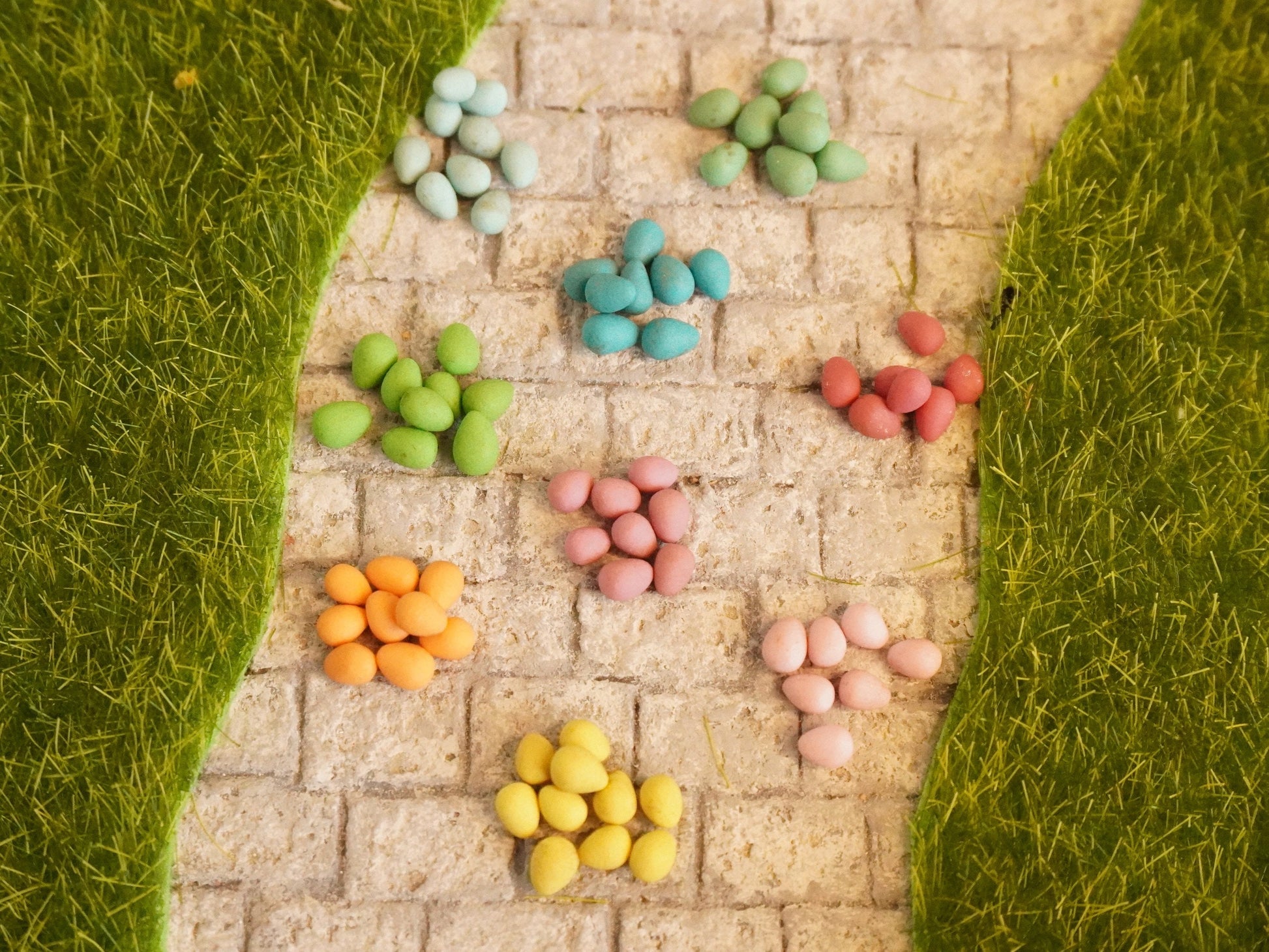 Dollhouse miniature colorful Easter eggs, handsculpted from polymer clay in 1:12 scale and then shaded with soft pastels.
