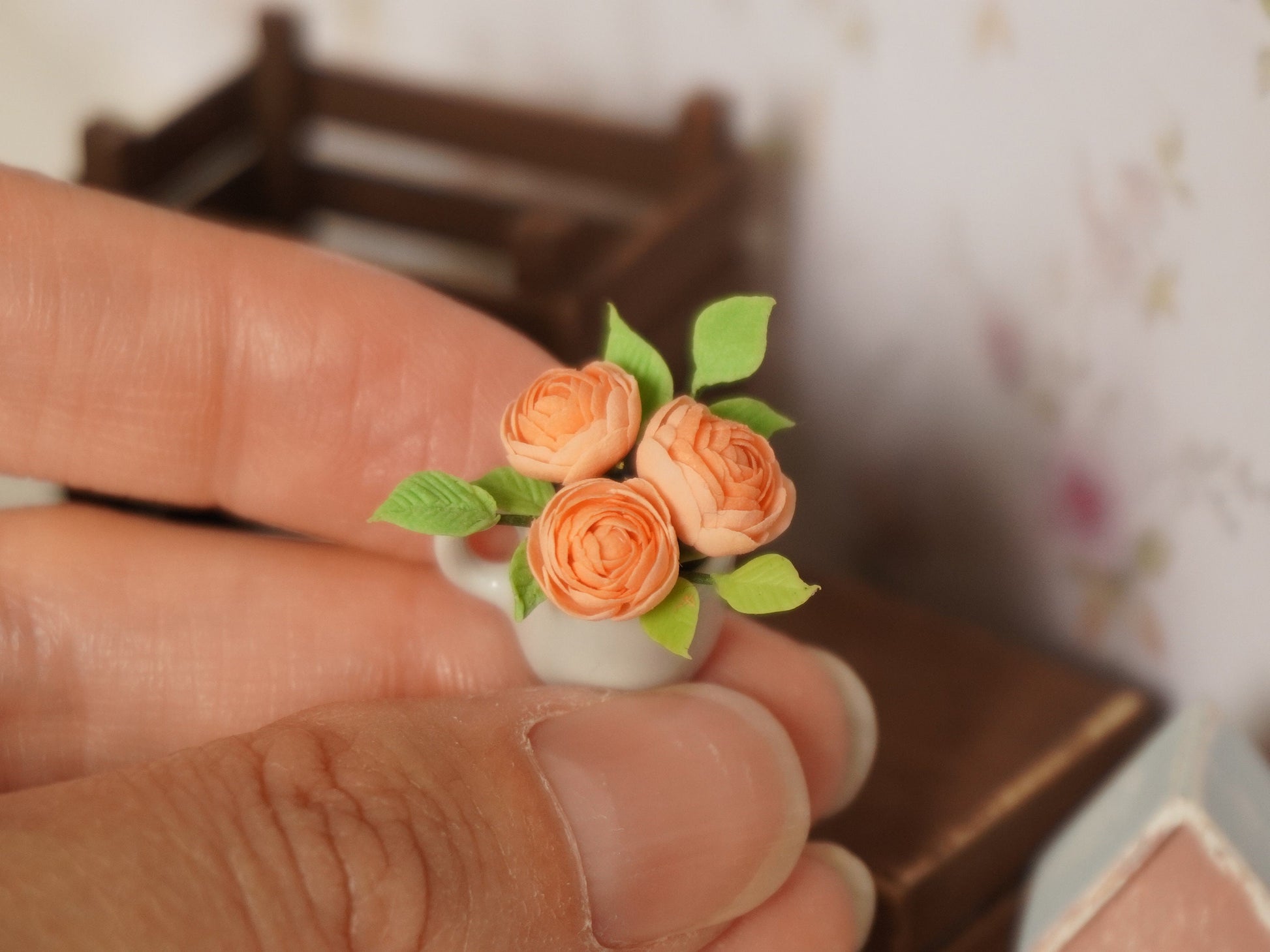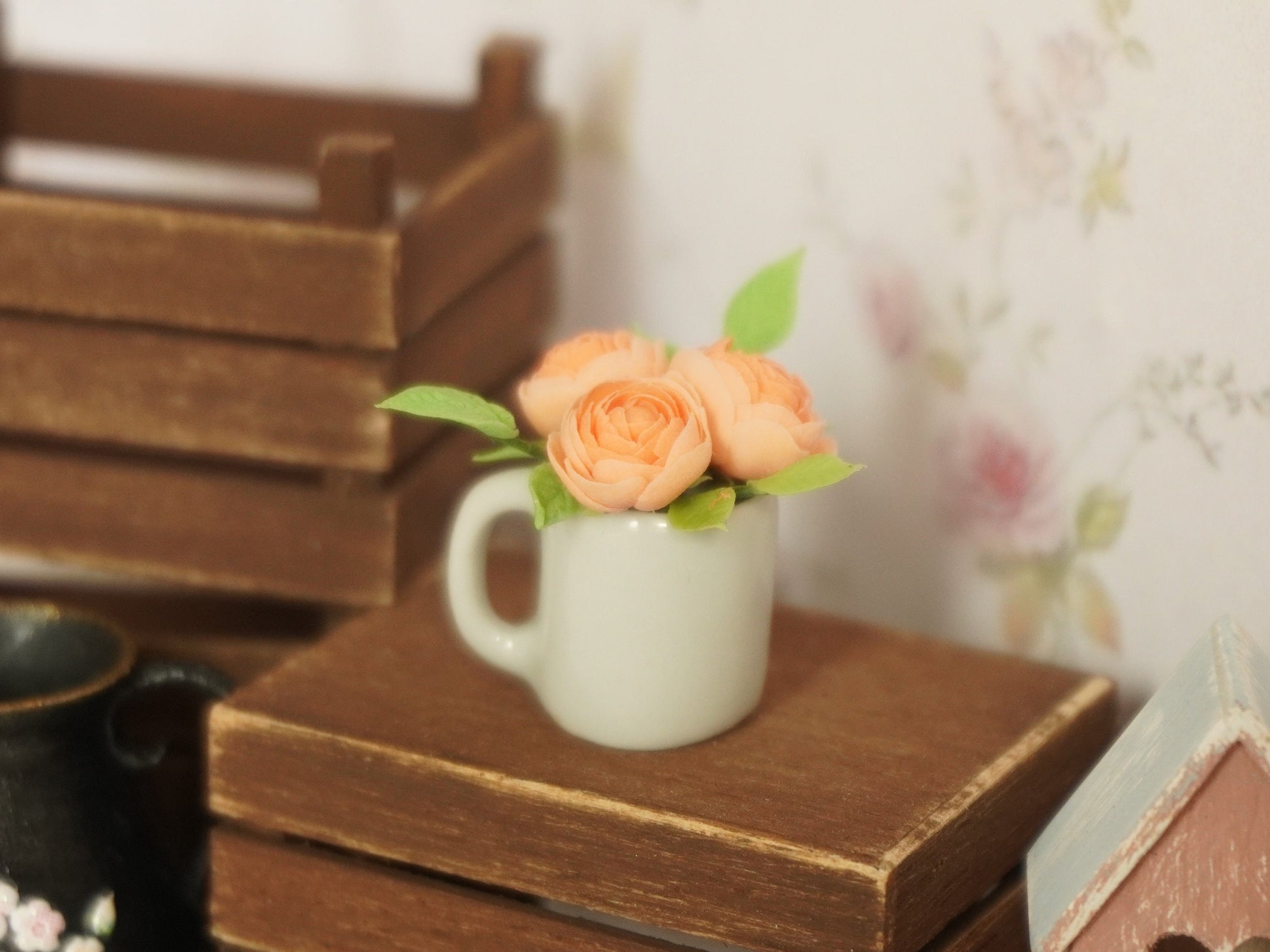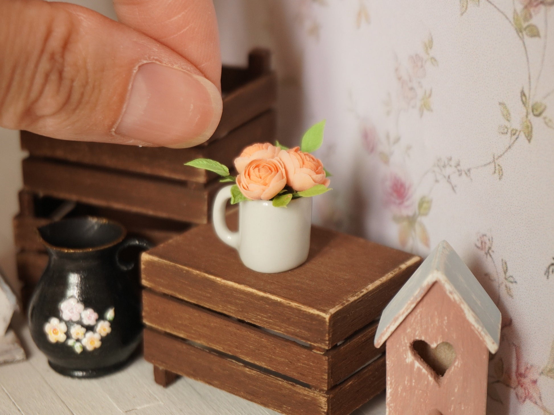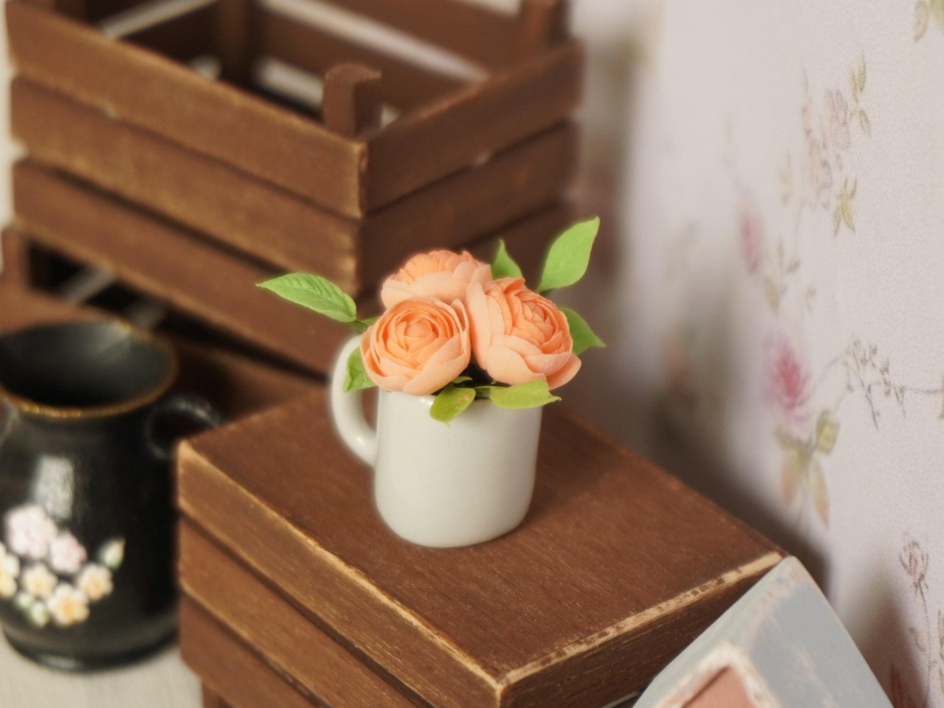 1:12 scale miniature handmade flowers peonies in ceramic tea cup.