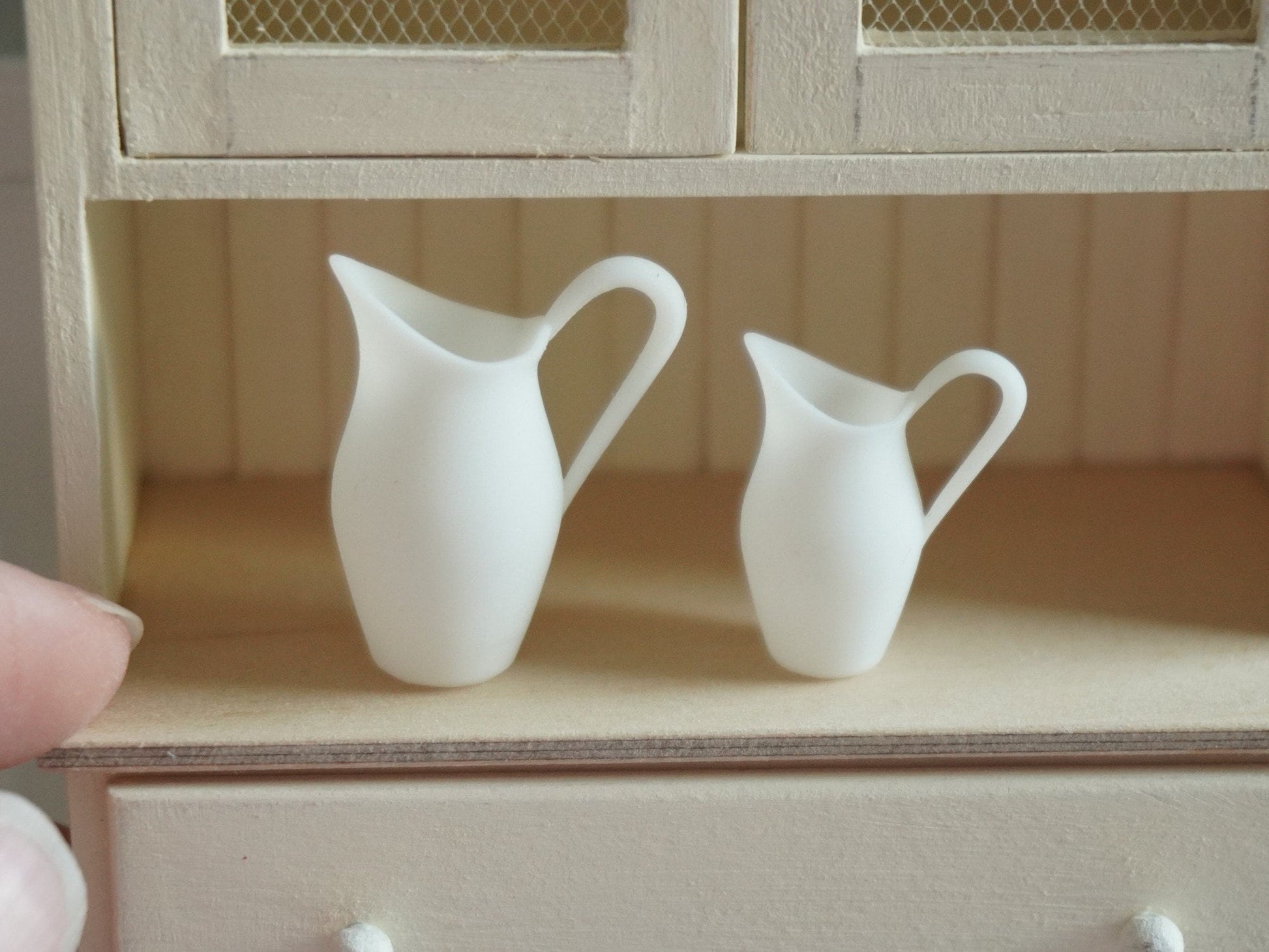 Dimensions are 2.5 cm (1") in height for the bigger and 2 cm (0.8") in height for the smaller jug.