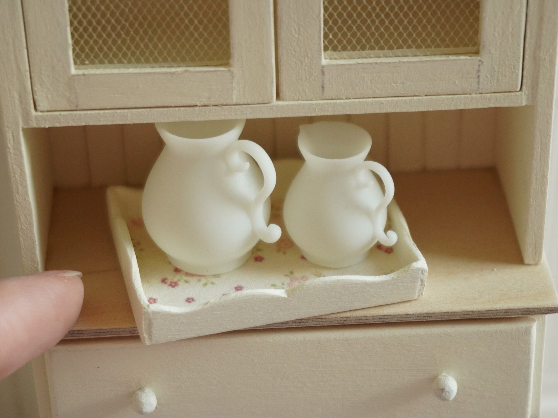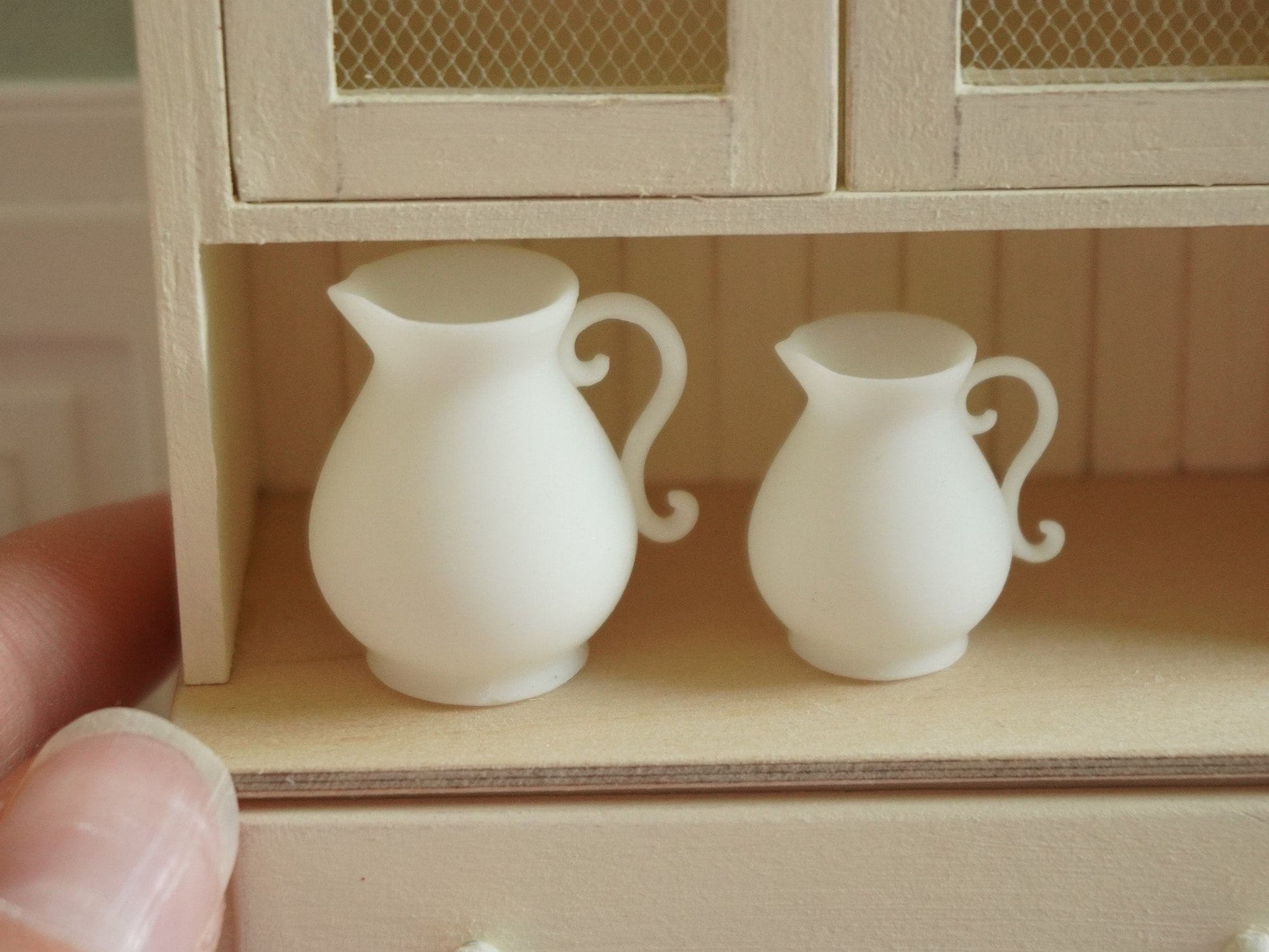 Dimensions are 2.5 cm (1") in height for the bigger and 2 cm (0.8") in height for the smaller jug.