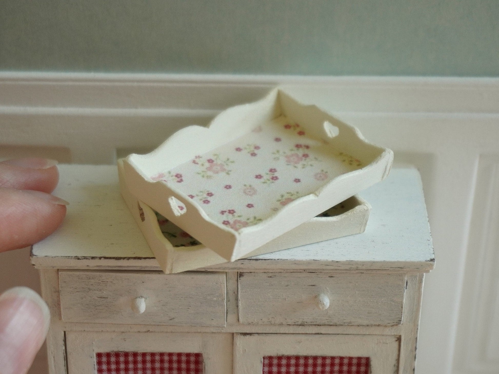 Miniature breakfast tray in 1:12 scale, handmade from wood and painted in pastel color for shabby look.