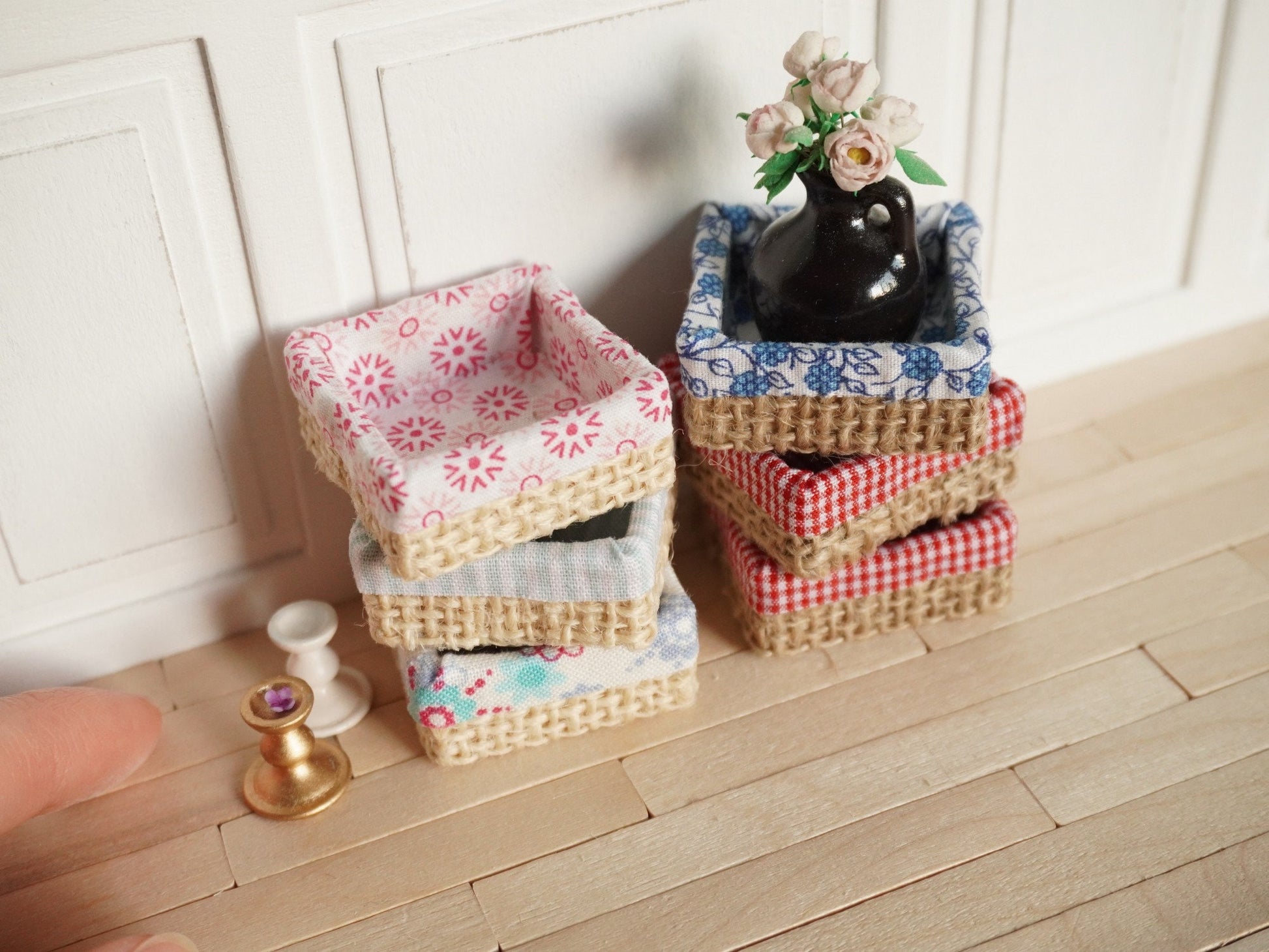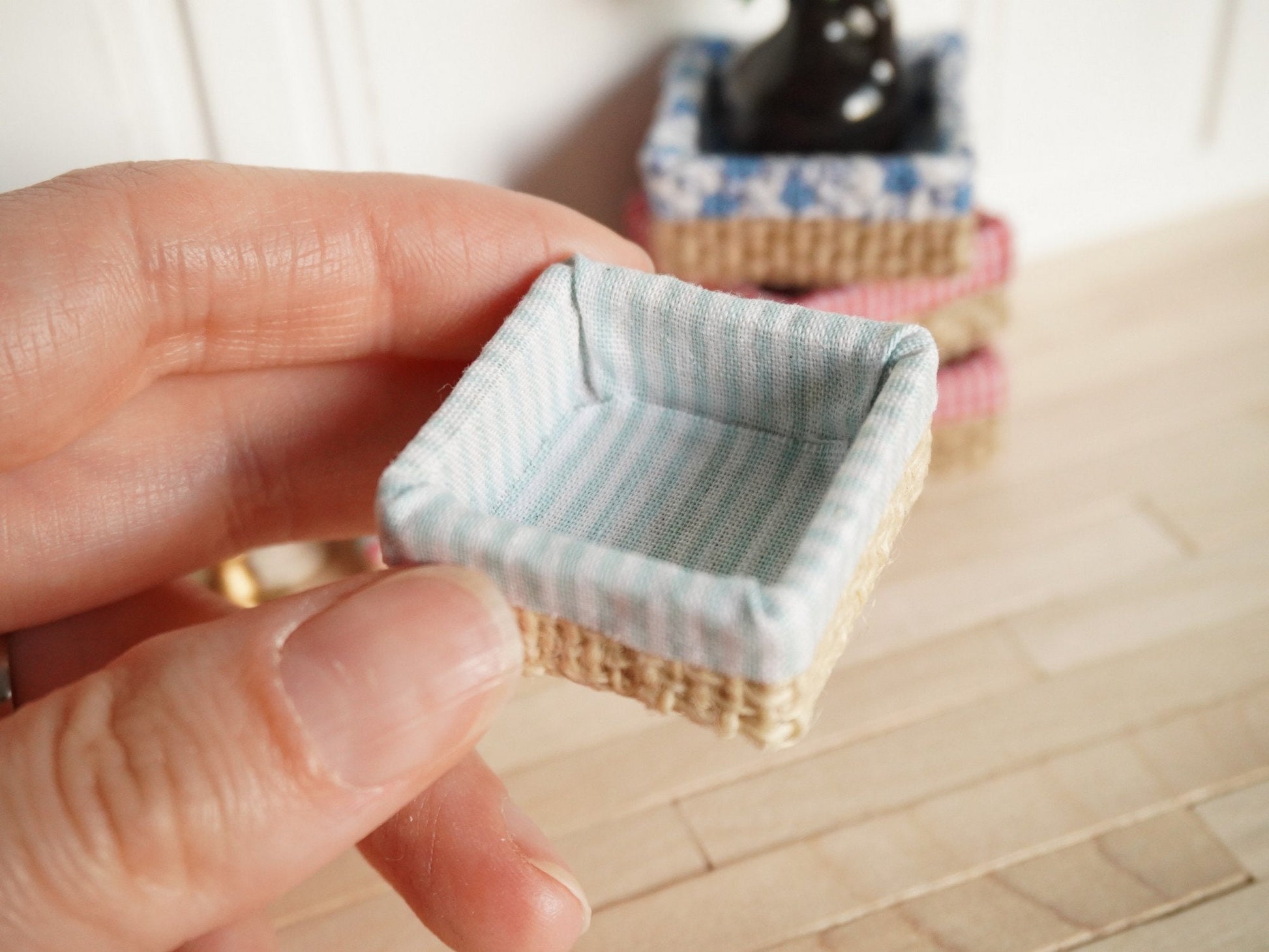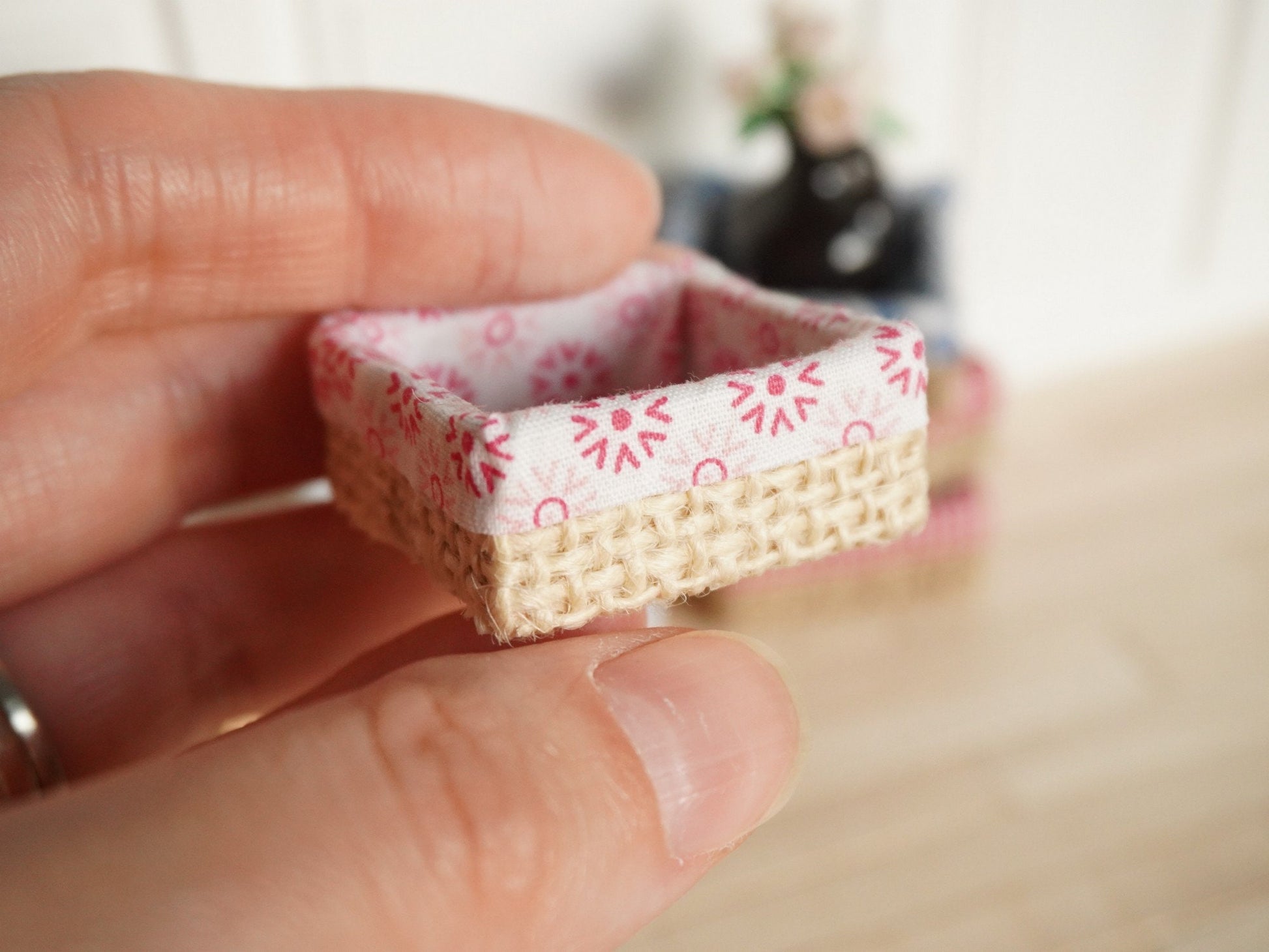 Miniature basket handmade from wood and decorated with delicate fabric for adorable shabby chic style. Made in 1:12 scale.