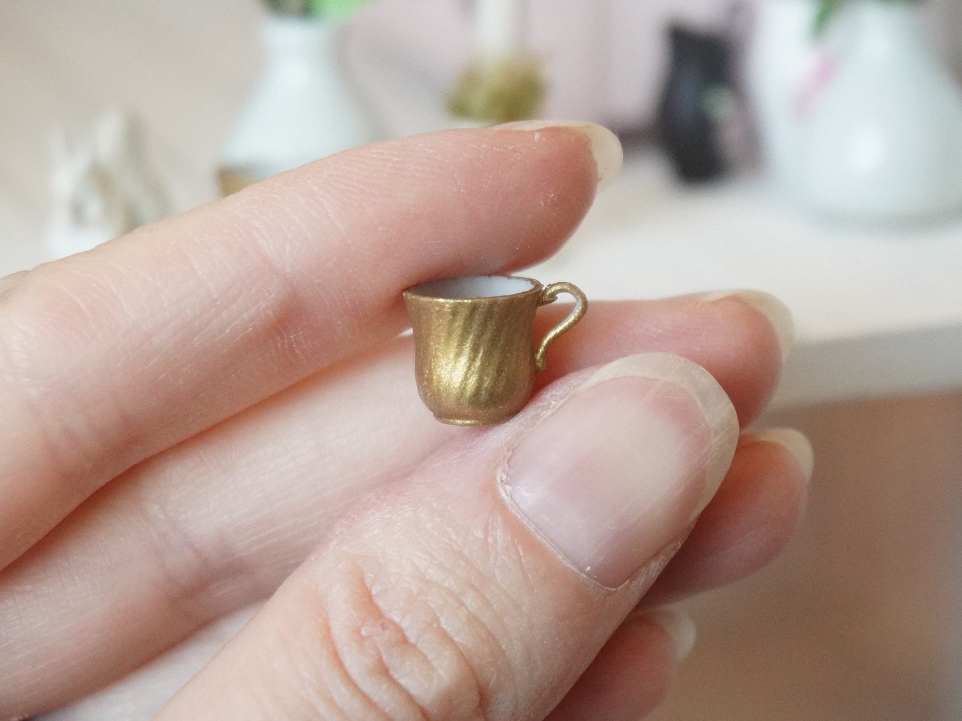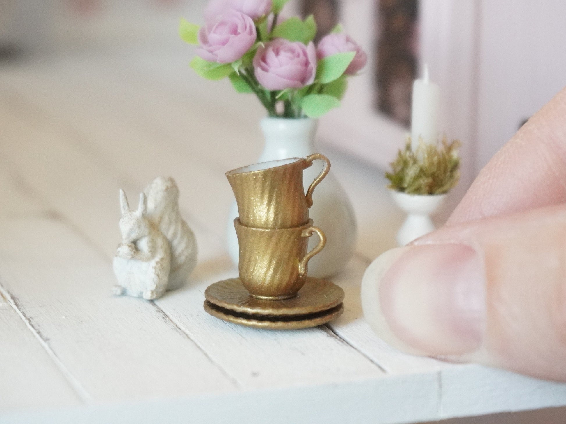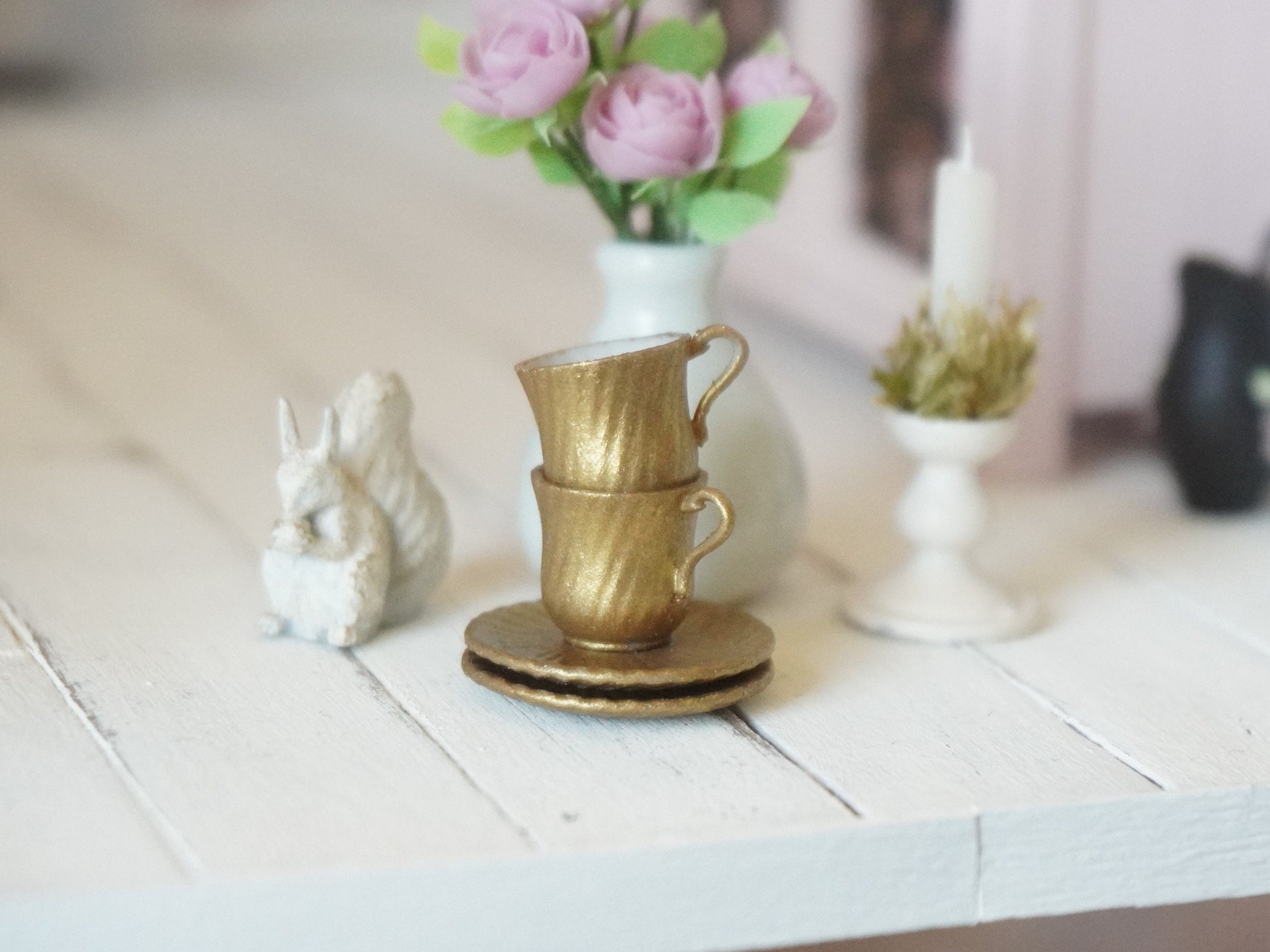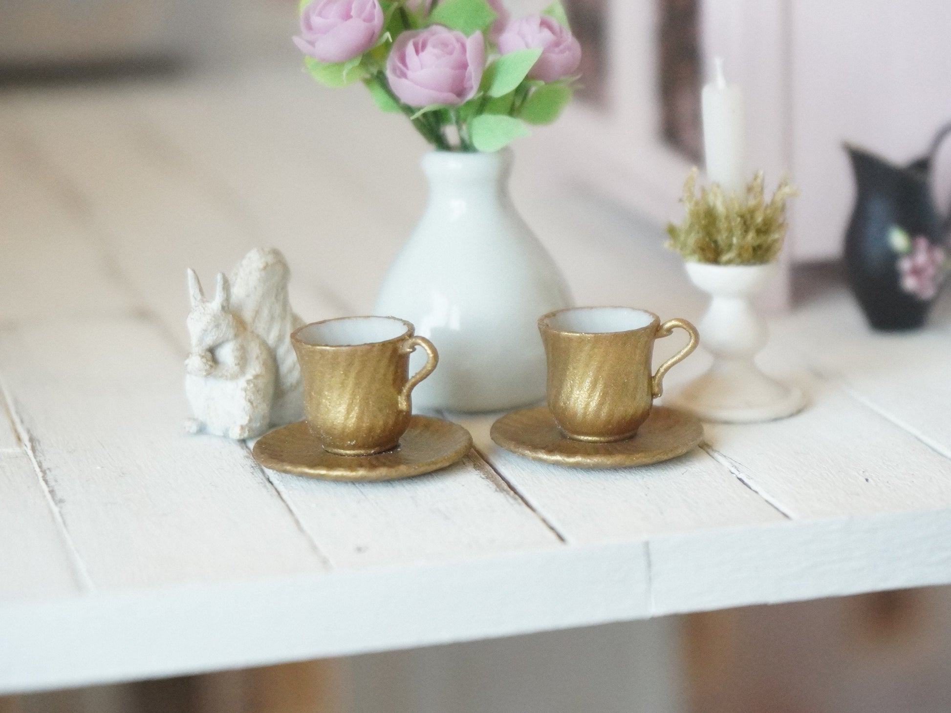 Set of 2 Gold Teacups and Saucers 1:12 Scale | Dollhouse Miniature Kitchenware