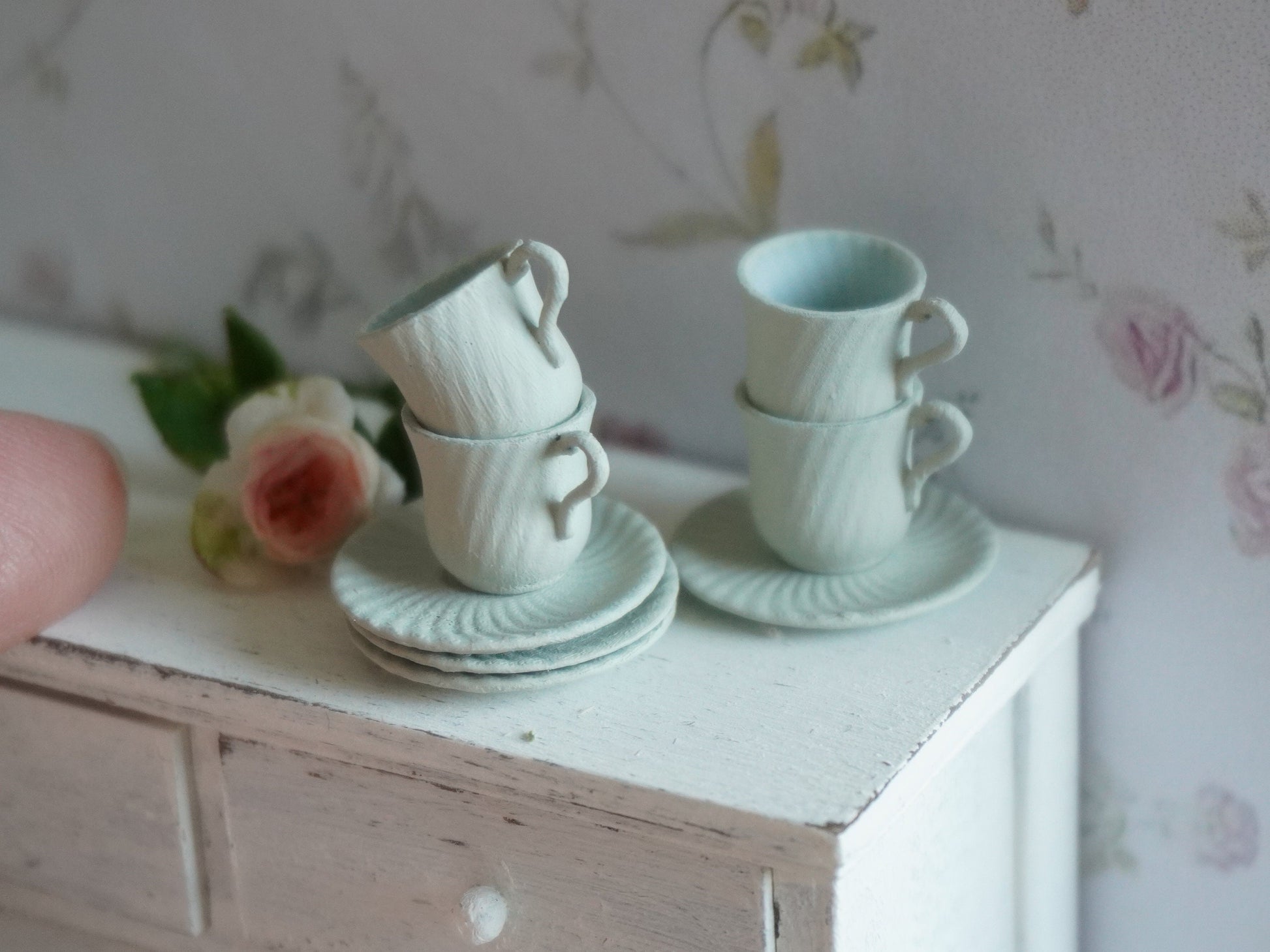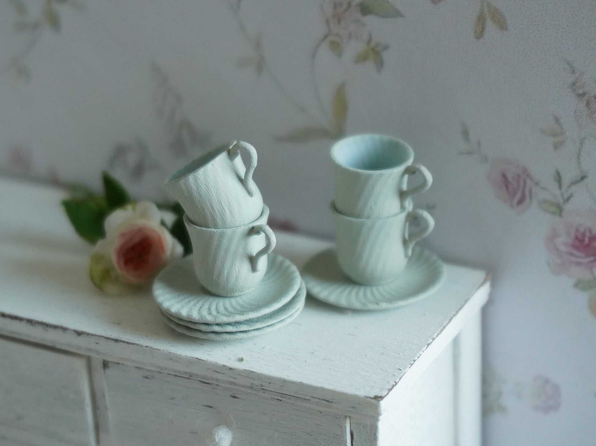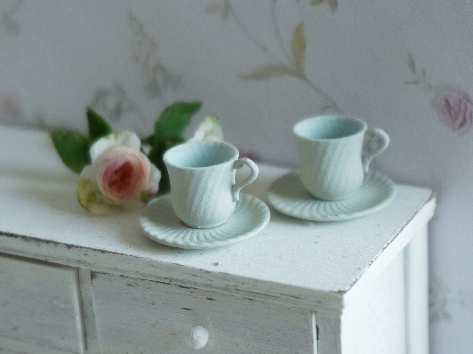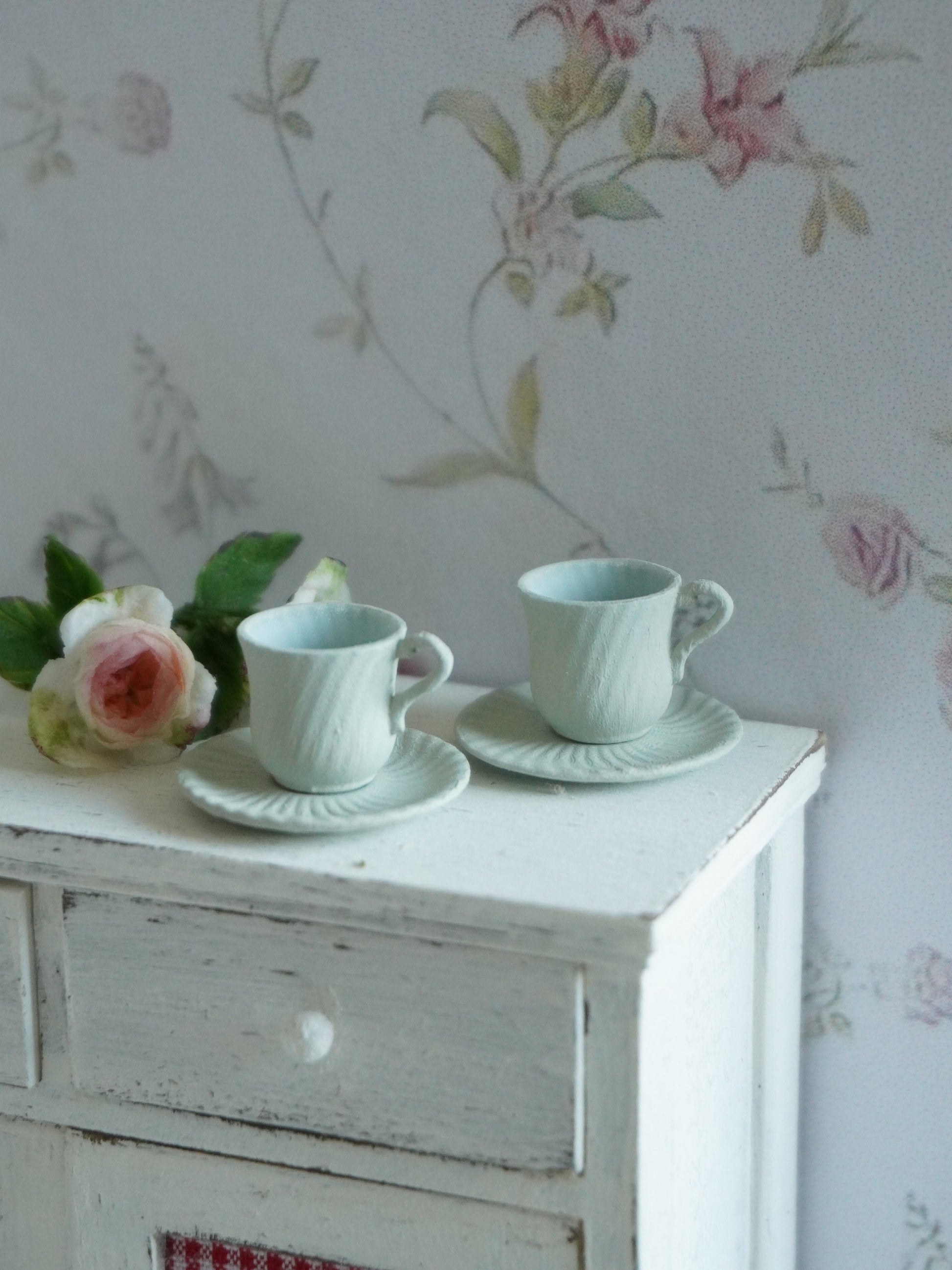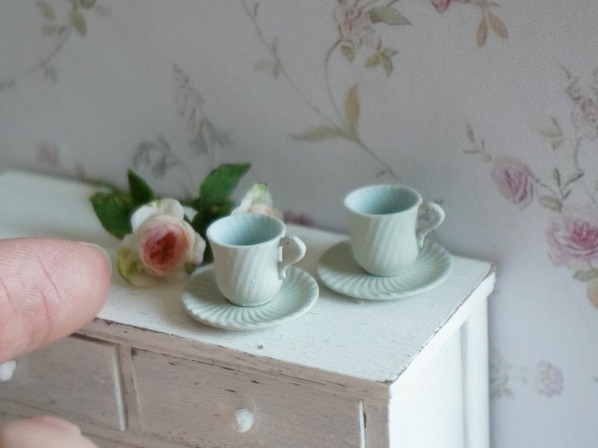 Set of 2 Teacups and Saucers 1:12 Scale Pastel Green | Dollhouse Miniature Kitchenware